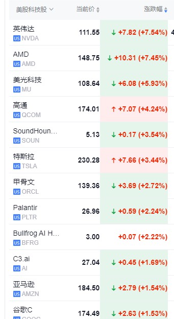 明星科技股多數反彈,AMD 盤初一度漲近 9%,公司二季度 AI 收入同比翻倍,上調 MI300 年度銷售額展望;