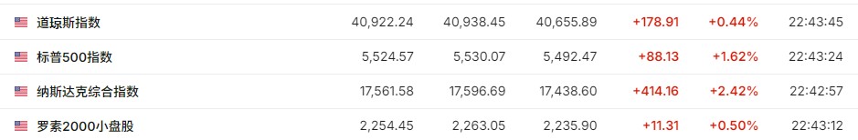 科技股居多的納指一度漲超 2.6% 且領跑主要股指;標普 500 指數大盤持續拉昇漲超 1.7%;與經濟週期密切相關的道指跌超 0.2% 後又漲超 0.4%;羅素小盤股指漲超 0.7% 後轉跌,現轉漲漲超 0.5%。