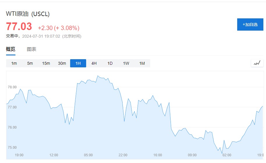截止發稿,WTI 原油漲幅擴大至 3.08%,報 77.03 美元/桶;布倫特原油日內漲 2.64%,現報 80.13 美元/桶。