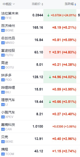 熱門中概股多數走高,嗶哩嗶哩漲超 5%,理想汽車漲超 3%。