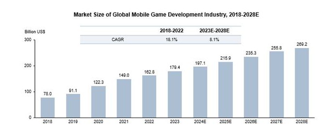 展望未来,在云游戏等关键趋势的推动下,全球移动游戏市场预计将继续强劲增长, AR/VR 集成,以及在智能手机使用率迅速增长的发展中地区的进一步地理扩张。随着 VR 在移动设备上获得更多身临其境的体验,该行业的前景仍然非常强劲。全球移动游戏发展的市场规模从 2023 年的 1794 亿美元增长到 2028 年的 2692 亿美元,复合年增长率约为 8.1%。