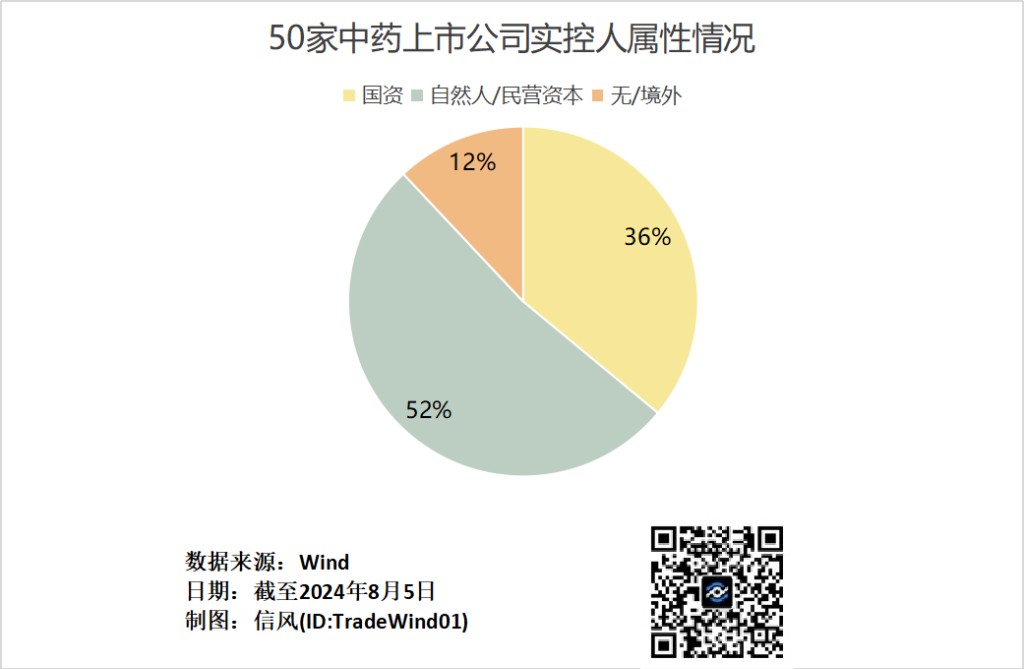 一方面,此次交易完成,在 A 股中藥市值前 10 名的公司中,國資包攬公司數將達到 6 家;另一方面,信風(ID:TradeWind01)以中證中藥的 50 家企業為樣本統計,由國資委控制的中藥上市公司數量已經達到 18 家(天士力也納入計算),佔比已超 3 成;同期由自然人或民營資本控制的上市公司數量為 26 家,佔比在 5 成左右。