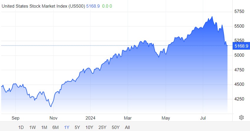 市場對經濟數據的高度敏感性在當前的波動中表現得尤為明顯。由於近期的恐慌拋售,標普 500 大盤從從 7 月 16 日的歷史最高收盤價 5667.2,週一曾跌超 8% 至 5186.33 點接近回調區間(回調是説從新高回落超 10%),截至週三收盤,雖然目前標普 500 指數已經小幅回升,但仍較歷史高點跌超 8%。