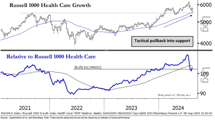 其次,投行 Oppenheimer 在其 OPCO Trifecta 名單中列出了一些突出的行業建議,其中一個建議是買入羅素 1000 指數醫療保健成長型股票。更廣泛地説,Oppenheimer 認為,標普 500 指數近期的疲軟"是上升趨勢中的一次修正",因為它不認為股市週期會以 7 月交易中出現的那種廣泛廣度結束。