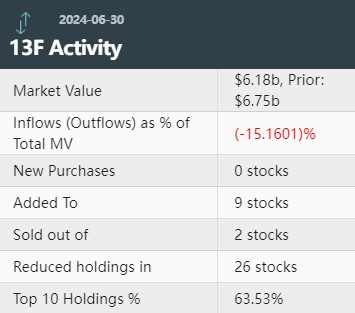 对冲基金经理 David Tepper 旗下的 Appaloosa Management 报告显示,其截至 2024 年 Q2 的持仓总市值为 61.8 亿美元,较上季度下降 8%。该基金在 Q2 增持了京东和贝壳,同时阿里巴巴依然是其头号重仓股,持有 1050 万股,市值约为 7.56 亿美元。前十大持仓标的占总市值 63.53%。
