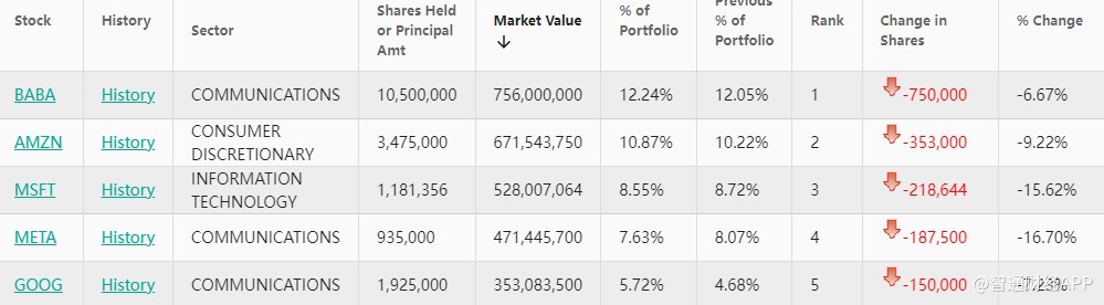 在前五大重仓股中,阿里巴巴 (BABA.US) 仍是头号重仓股,持仓 1050 万股,持仓市值约 7.56 亿美元,占投资组合比例为 12.24%,持仓数量较上季度减少 6.67%。