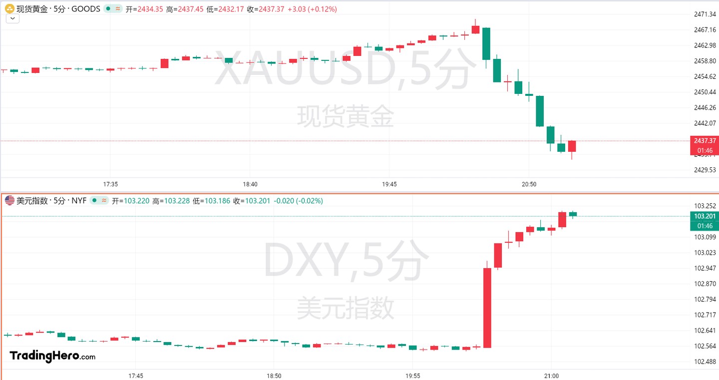 數據公佈後,黃金短線下挫近 40 美元;美元指數短線走高近 60 點;非美貨幣普跌,歐元兑美元短線下挫近 60 點;英鎊兑美元短線下挫 60 餘點;美元兑日元短線上揚 150 點,日內漲超 1%。