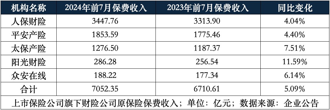 信風(ID:TradeWind01)統計發現,5 家上市險企旗下財險公司前 7 個月共攬保費 7052.35 億元,增幅為 5.09%。