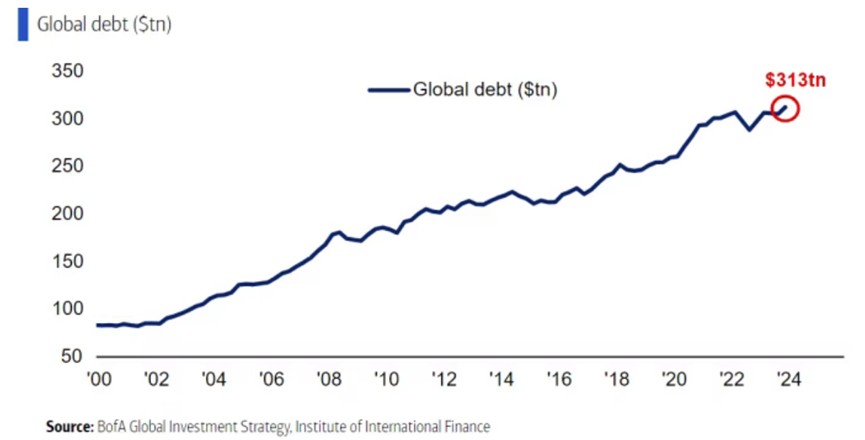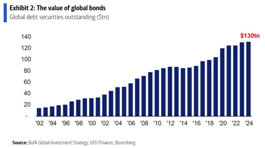 圖例:圖中展示了全球負收益債務(Global negative yielding debt)的總額從 2010 年到 2024 年的變化趨勢。從圖中可以看到,負收益債務在 2021 年達到了峯值 17.8 萬億美元,隨後幾年急劇下降,到 2024 年幾乎為零。Michael Hartnett 表示,在過去的幾年裏,隨着負收益債務的減少,全球經濟經歷了從依賴寬鬆的貨幣政策(如低利率和量化寬鬆)轉向更多依賴財政政策(如增加政府支出和債務融資)。