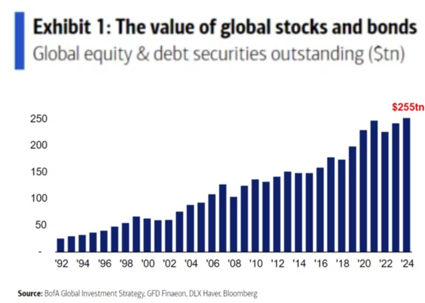 A. 截至 2024 年 7 月為 255 萬億美元,創歷史新高。自 2008 年 104 萬億美元的低點以來,全球股票和債券的價值已經上漲了 2.5 倍。