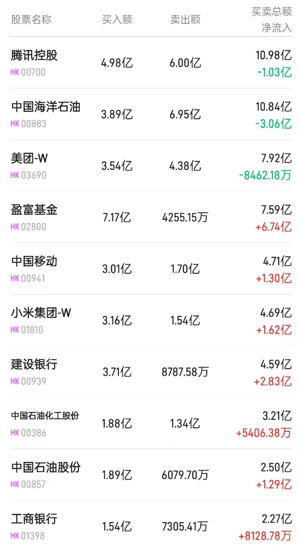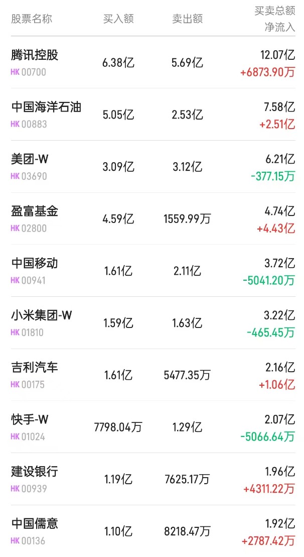 北水淨買入最多的個股是盈富基金 (02800)、建設銀行 (00939)、小米集團-W(01810)。北水淨賣出最多的個股是中海油 (00883)、騰訊 (00700)。