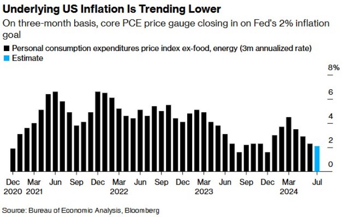 美國商務部將於北京時間 20:30 公佈美國 7 月 PCE 物價指數,這是一個衡量消費者為各種商品和服務以及他們的支出偏好的龐大指標。經濟學家預計,美聯儲青睞的衡量潛在通脹的指標——核心 PCE 物價指數——將在 7 月連續第二個月環比上升 0.2%,這將使所謂的三個月核心通脹年化率降至 2.1%,略高於美聯儲 2% 的目標;還預計整體 PCE 物價指數將環比上升 0.2%,同比上升 2.6%。