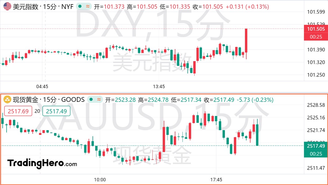 PCE 數據公佈後,現貨黃金短線走低 6 美元,美元指數短線走高 16 點。美國短期利率期貨小幅下跌。 美國股指期貨小幅上漲。