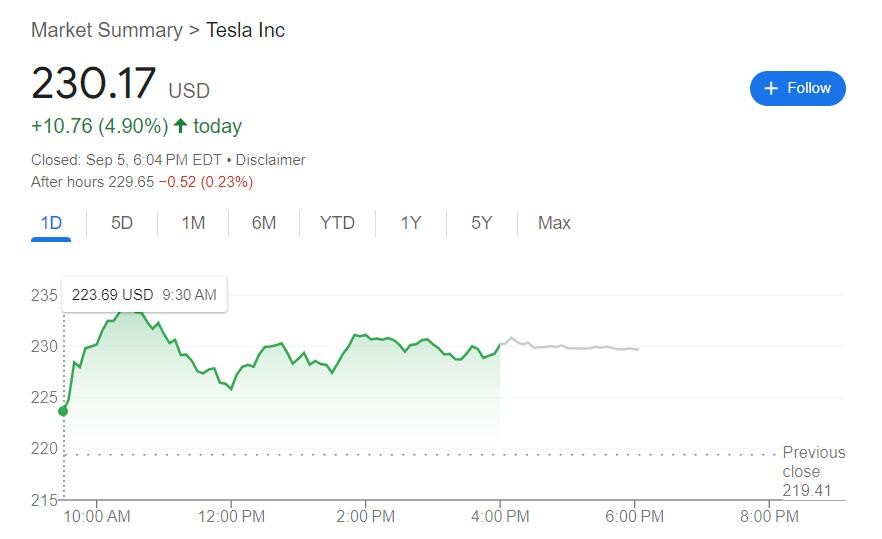 美東時間 9 月 5 日週四,特斯拉股價早盤曾漲至約 235 美元,刷新 7 月 23 日以來盤中高位,日內漲幅達 7.1%,後漲幅收窄,午盤曾漲 4% 左右,收漲 4.9%,收創 7 月 31 日以來新高,週三和週四兩日累計反彈約 9.3%。