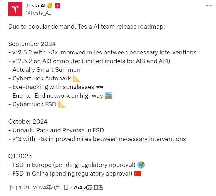 在最新的 X 帖子中,特斯拉 AI 團隊還介紹了近期 FSD 的迭代改進,包括 9 月推送 V12.5.2 版本,接管率提升 3 倍,該版本適配 HW3.0 平台,實現與 4.0 平台統一模型;推送真·智能召喚功能;推送 Cybertruck 自動泊車;注意力檢測支持佩戴太陽墨鏡;高速公路和城市統一技術棧,全部基於端到端;推送 Cyberturuck 的 FSD 功能;10 月將推送 FSD 倒車和車位 - 車位能力,同時 V13 版本平均接管率再提升 6 倍。