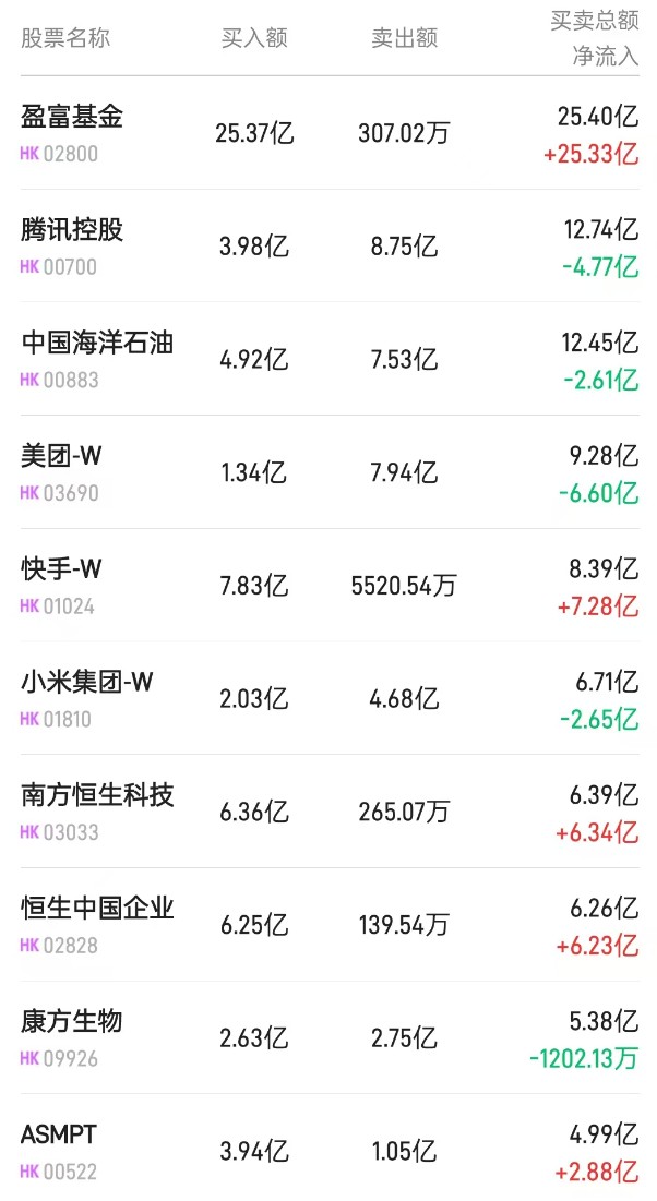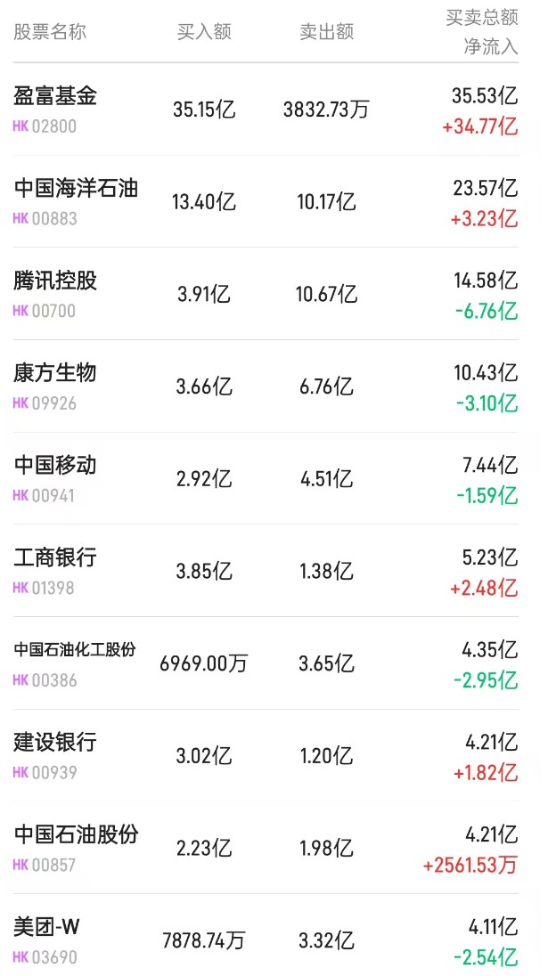 北水淨買入最多的個股是盈富基金 (02800)、快手-W(01024)、南方恒生科技 (03033)。北水淨賣出最多的個股是騰訊 (00700)、中石化 (00386)、中國移動 (00941)。