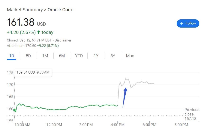 公佈以上預期後,本週四收漲約 2.7% 的甲骨文股價盤後加速上漲,盤後漲幅一度接近 7%,若週五保持這一漲勢,甲骨文將連續第四日創收盤歷史新高。