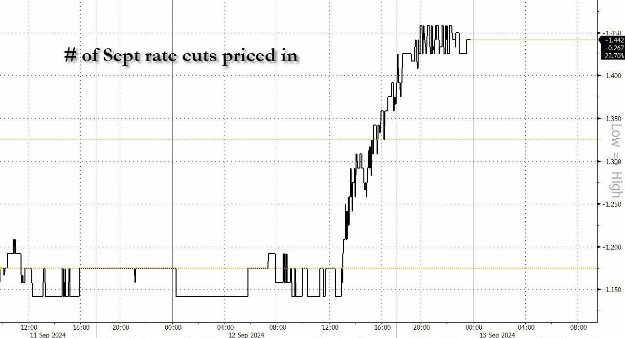 這篇文章是在 30 年期美國國債拍賣的同一時間發表的,這就是為什麼許多人一開始都不明白鷹派的拍賣會怎麼會引發鴿派的市場反應。這是多麼令人震驚的反應啊:9 月降息的幾率在短短几個小時內從 15%(強於預期的 CPI 報告公佈後)飆升至 45%,因為市場相信 Timiraos 再次為美聯儲傳話,並暗示降息 50 個基點的可能性。