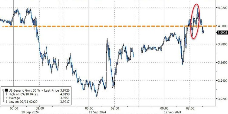 文中的 “鴿派” 表述引發市場劇烈反應,隔夜美國 30 年期國債拍賣慘淡後,收益率突破 4.00%,但隨後 Timiraos“鴿派” 表述又帶動長期美債反彈,市場相信美聯儲借 Timiraos 之口把 “50 基點” 的選擇擺上枱面。