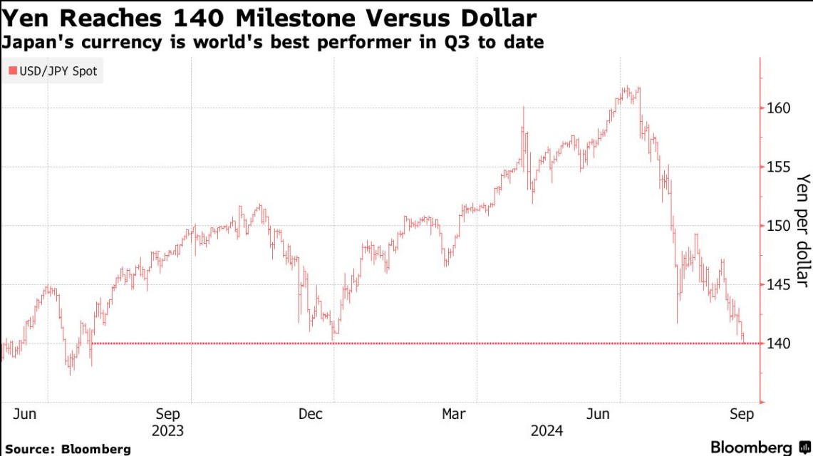 日元兑美元突破 140的關鍵心理關口,延續了自 7 月觸及近 38 年低點以來的漲勢。週一,日元兑美元一度升值 0.6%,至 139.96,為 2023 年 7 月以來的最高水平。日元是本季度表現最好的 10 國集團貨幣,由於投資者預期美國和日本之間的利率差距會進一步縮小,日元上漲了 15%。