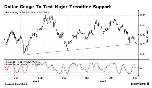 债券交易员再次押注美联储在本周会议上降息 50 个基点的可能性超过 25 个基点。掉期定价显示,降息 50 个基点的概率已超过 50%。这导致两年期美国国债收益率降至两年最低,美元指数跌至今年最低。分析师对美联储的决策存在分歧,荷兰合作银行预计降息 25 个基点,而法国兴业银行认为市场可能迫使美联储降息 50 个基点。渣打银行警告,降息 50 个基点的风险更大,可能导致失业率上升。