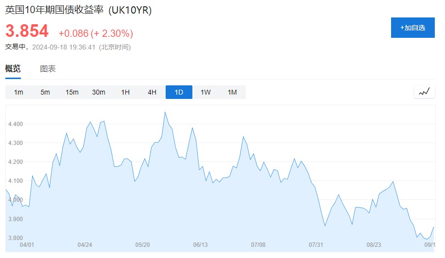 英國 10 年期國債收益率日內上行近 9 個基點。稍早前數據顯示,英國 8 月通脹率持穩在 2.2% 的水平,好於央行預期,英國央行年內進一步降息的預期升温,但市場仍認為本週英國央行或維持利率不變。