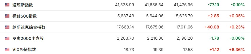 - 美股三大指數:標普 500 指數收跌 0.29%,報 5618.26 點。與經濟週期密切相關的道指收跌 103.08 點,跌幅 0.25%,報 41503.10 點。科技股居多的納斯達克綜合指數(納指)收跌 54.76 點,跌幅 0.31%,報 17573.30 點。