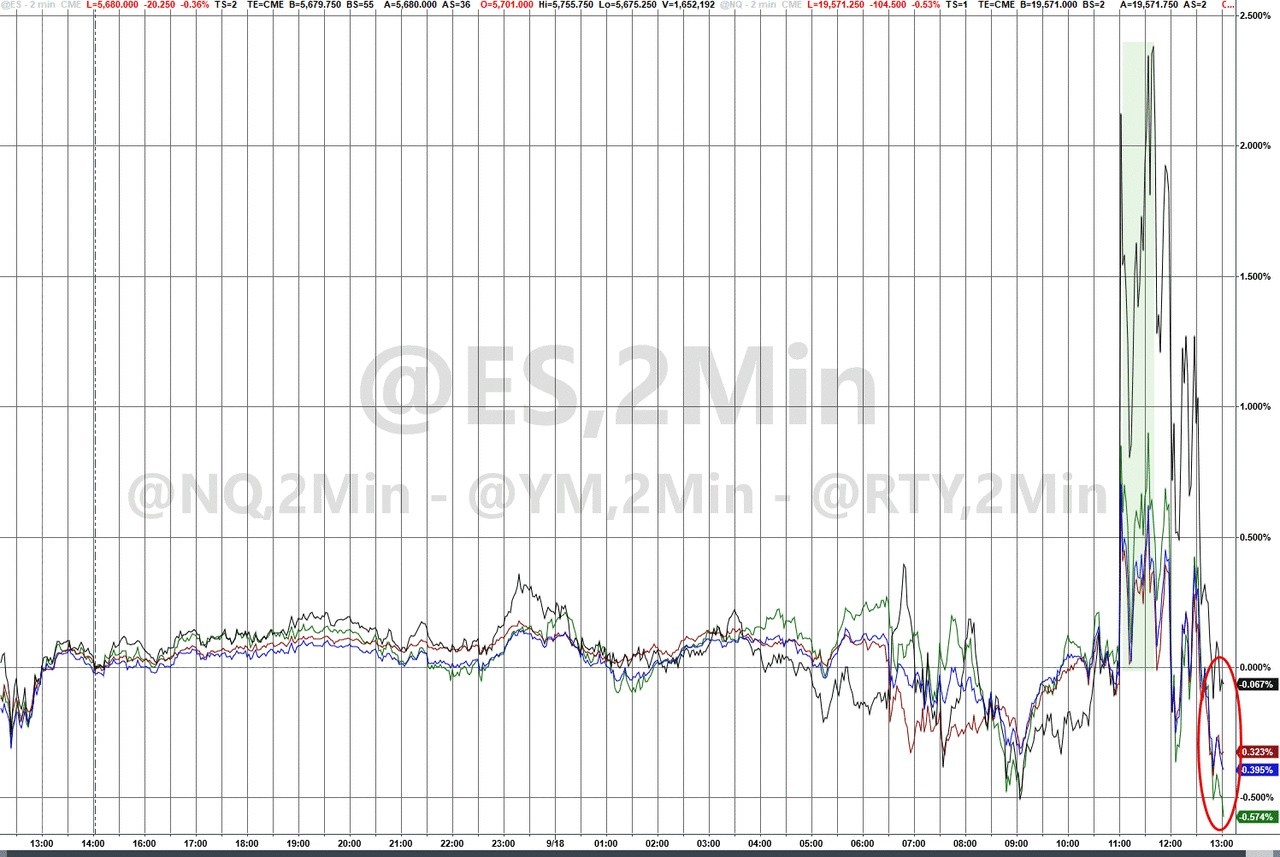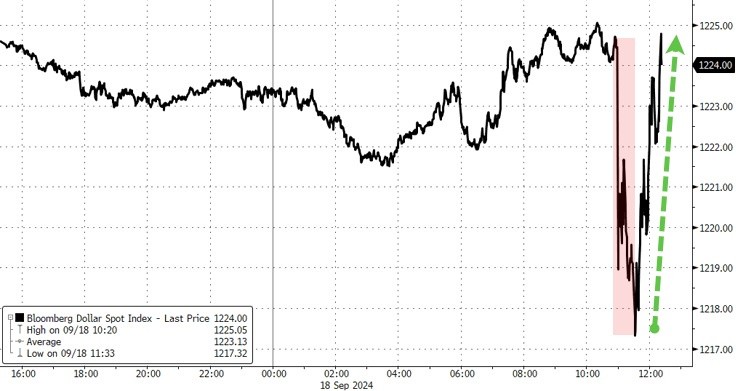 美聯儲宣佈大幅降息 50 個基點,並暗示今年還會降 50 個基點,但金融市場未能保持降息決議公佈後的走勢,美股衝高回落,主要股指盤中轉跌,黃金拉昇超 1% 至歷史新高後也轉跌,美債價格轉跌,盤中跳水的美債收益率轉升。