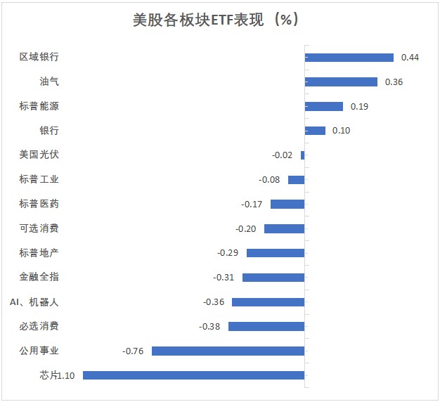 - ETF:美股行業 ETF 和大類資產 ETF 收盤多數下跌收盤多數下跌。區域銀行 ETF 與銀行業 ETF 各漲不足 0.5%,農產品基金與大豆基金各漲超 0.5%,而半導體 ETF 跌逾 1%,科技行業 ETF 與公用事業 ETF 各跌接近 1%,全球科技股 ETF 跌超 0.5%,美國布倫特油價基金與美國國債 20+ 年 ETF 各跌超 1%,恐慌指數做多-iPath 與黃金 ETF-SPDR 跌幅接近 1%,美國國債 7-10 年 ETF、納指 100ETF 及美國投資級公司債 ETF 跌幅接近 0.5%。