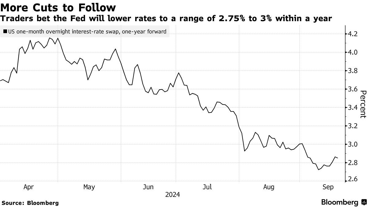 儘管美聯儲主席鮑威爾將週三降息 50 個基點的決議描述為對政策的 “重新調整”,但市場對今年及以後進一步寬鬆的速度和幅度的押注幾乎沒有變化。貨幣市場傾向於認為,美聯儲在年底前還將進行三次各 25 個基點的降息,預計明年還將降息 200 個基點。這樣的預期比美聯儲最新公佈的點陣圖所顯示的利率路徑要更激進,點陣圖只顯示今年還會再降息 50 個基點。