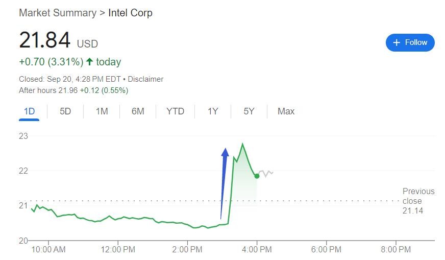 傳出曾和高通商談併購的消息後,週五午盤刷新日低時跌逾 3.7% 的英特爾股價盤中拉昇,迅速抹平跌幅轉漲,刷新日高至 23.12 美元時,日內漲近 9.4%,較日內低位 20.35 美元反彈約 13.6%。因股價波動過大,,曾觸發暫停交易。最終,英特爾收漲 3.3%。