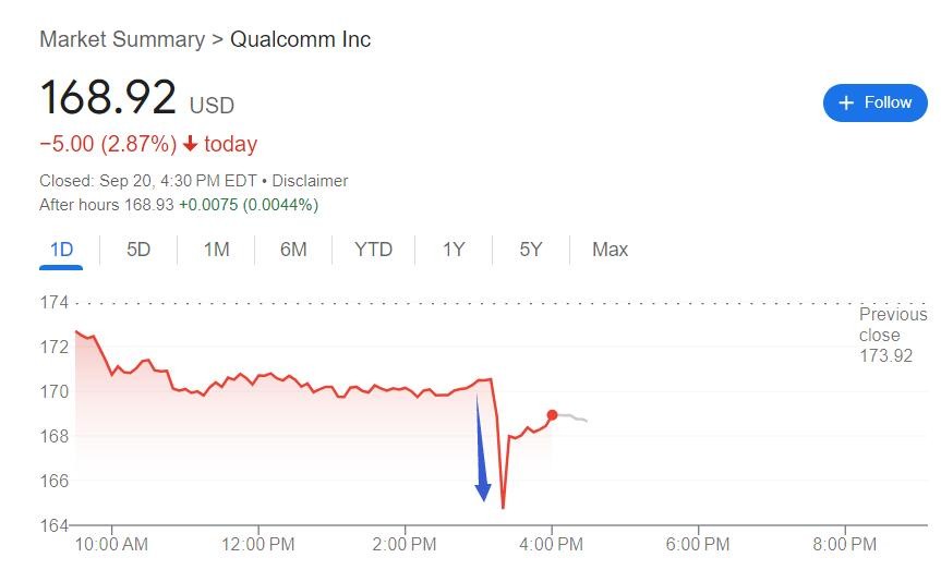 傳出消息後,高通的股價盤中跌幅急劇擴大,短短 10 分鐘左右,股價從 170.50 美元上方跌至 164.30 刷新日低,日內跌幅從不足 2% 擴大到 5.5%,尾盤跌幅收窄,最終收跌近 2.9%。