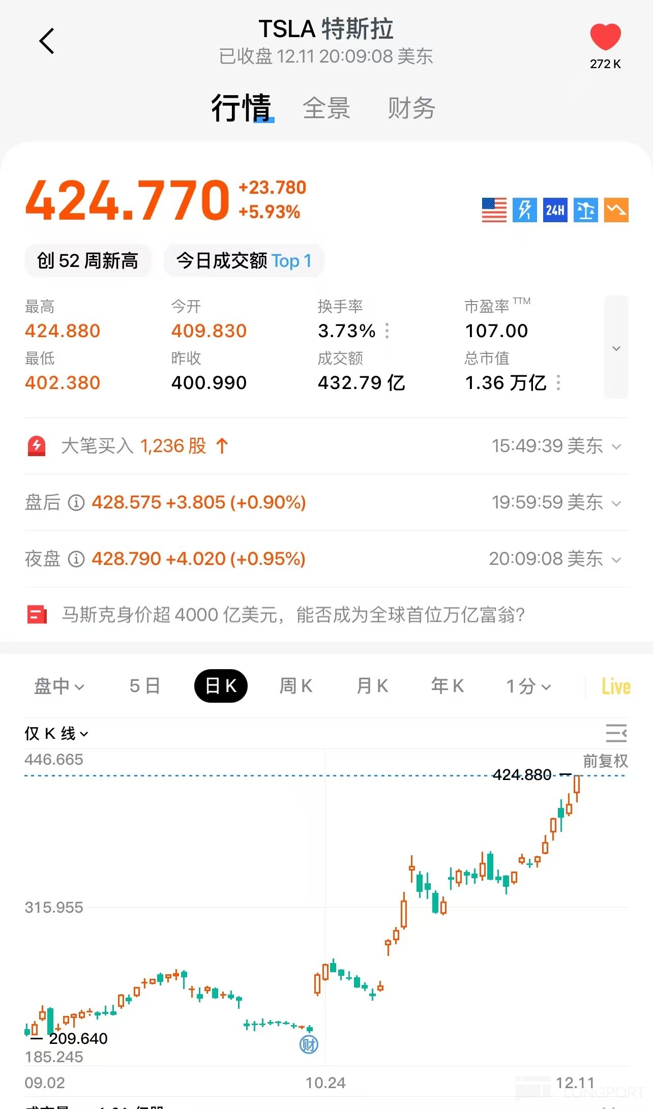美東時間 12 月 11 日週三,特斯拉股價在美股午盤加速上行,尾盤一度漲至 424.88 美元,日內漲約 6%,創盤中歷史新高,最終收漲逾 5.9%,報 424.77 美元,連漲六個交易日,刷新 2021 年 11 月 4 日所創的收盤最高紀錄。