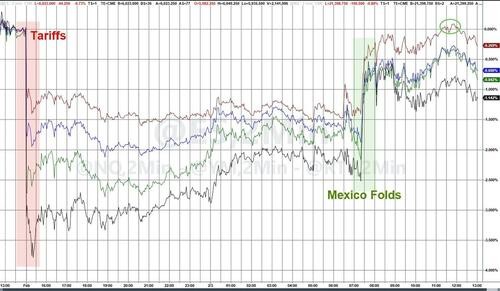 分析指出,市場對關税威脅持懷疑態度,將其視為典型的 “大棒加胡蘿蔔” 外交策略。隨着關税相關消息鋪天蓋地,美股早盤出現下跌,但科技巨頭跌幅有限。隨後,特朗普宣佈關税政策延期,市場果然出現了大逆轉,歐美股指和美債收益率跌幅迅速收窄。高盛樂觀指出,儘管前景不明朗,但針對加拿大和墨西哥的關税 “可能是短期的”。