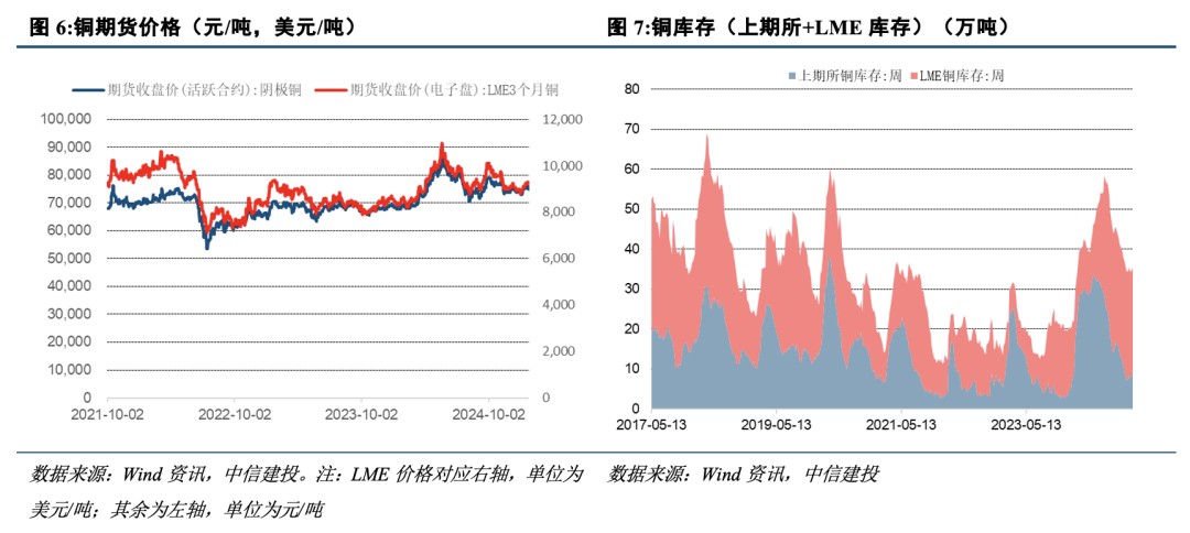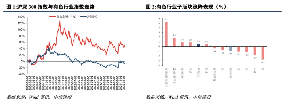 (2) 銅鋁價格在關税威脅前的不屈表現。截止 2 月 4 日下午 15:00,LME 銅報收 9147.5 美元/噸,較中國節前收盤價跌 0.85%,LME 鋁報收 2619 美元/噸,基本持平於中國節前收盤價。面對美國大規模徵收貿易關税的威脅,春節期間銅鋁價格表現抗跌。首先,全球主要經濟體的製造業數據表現尚佳:中國 1 月財新制造業 PMI 為 50.1,景氣度連續第四個月保持擴張;美國 1 月 ISM 製造業 PMI 為 50.9,預期 49.8,前值 49.3。其次,美國對中國加徵 10% 的關税,存在預期差。其三,市場流動性充裕,市場對中國節後經濟復甦存在樂觀情緒。其四,銅鋁的供應並不那麼寬裕,2025 年全球銅鋁的產量增量分別為 2.4%、1.6%,而消費端全球電動汽車、人工智能蓬勃發展對銅的電需求及鋁的輕量化前景廣闊,墊高銅鋁價格重心。
