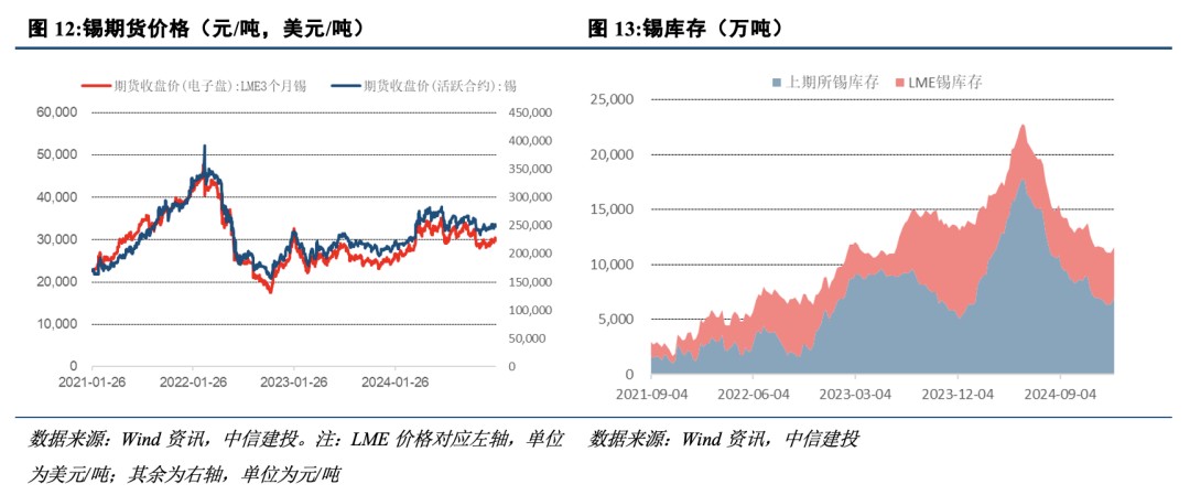工業金屬:節前一週 LME 銅、鋁、鉛、鋅、錫價格變化為 1.0%、-1.8%、-1.5%、-4.1%、1.0%;春節期間 (1 月 27 日至 2 月 3 日) LME 銅、鋁、鉛、鋅、錫價格變化為-1.7%、-0.4%、0.4%、-0.5%、-0.7%;工業金屬價格由 “金融屬性” 及 “商品屬性” 共同決定,從金融屬性來看,美聯儲已開啓降息週期;從商品屬性來看,全球銅鋁庫存均處於相對低位,中國經濟復甦可期,疊加新能源行業的拉動,銅鋁需求增長將有所好轉。