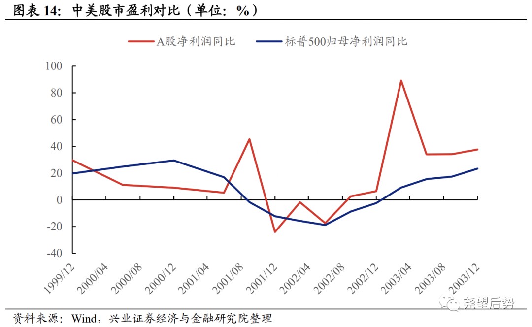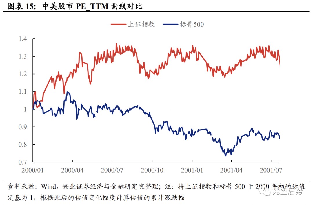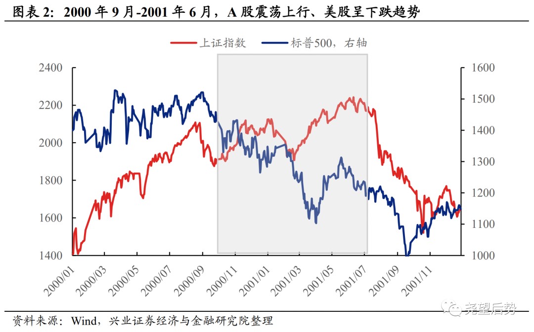 2000 年 9 月底至 2001 年 6 月底,上证指数、深证成指和万得全 A 上涨 18.9%、7.4%、15.3%,同期的标普 500、道指和纳指下跌 15.3%、2.8%、45.2%,A 股相对美股的超额收益 (上证指数与标普 500 区间涨跌幅之差,全文同) 为 34.2%。