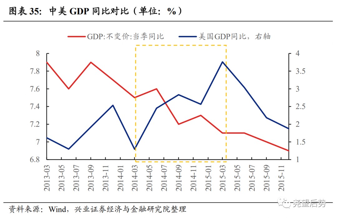 2013 年底-2015 年,中美政策周期显著分化,中国放松、美国收紧。由于金融危机爆发以来,美国长期维持相对宽松的货币政策,而我国于 2010 年起对政策边际收紧,因此 2013 年以来美国经济呈增长态势,而我国经济增速出现回落。所处经济周期中的不同位置导致了中美制定政策的出发点相差甚远。美国方面,为应对逐渐过热的经济,美联储刚结束 QE3,并逐渐开始向市场释放加息的信号。中国方面,随着经济下行压力较大,中央政策定调转松,央行多次降息降准。