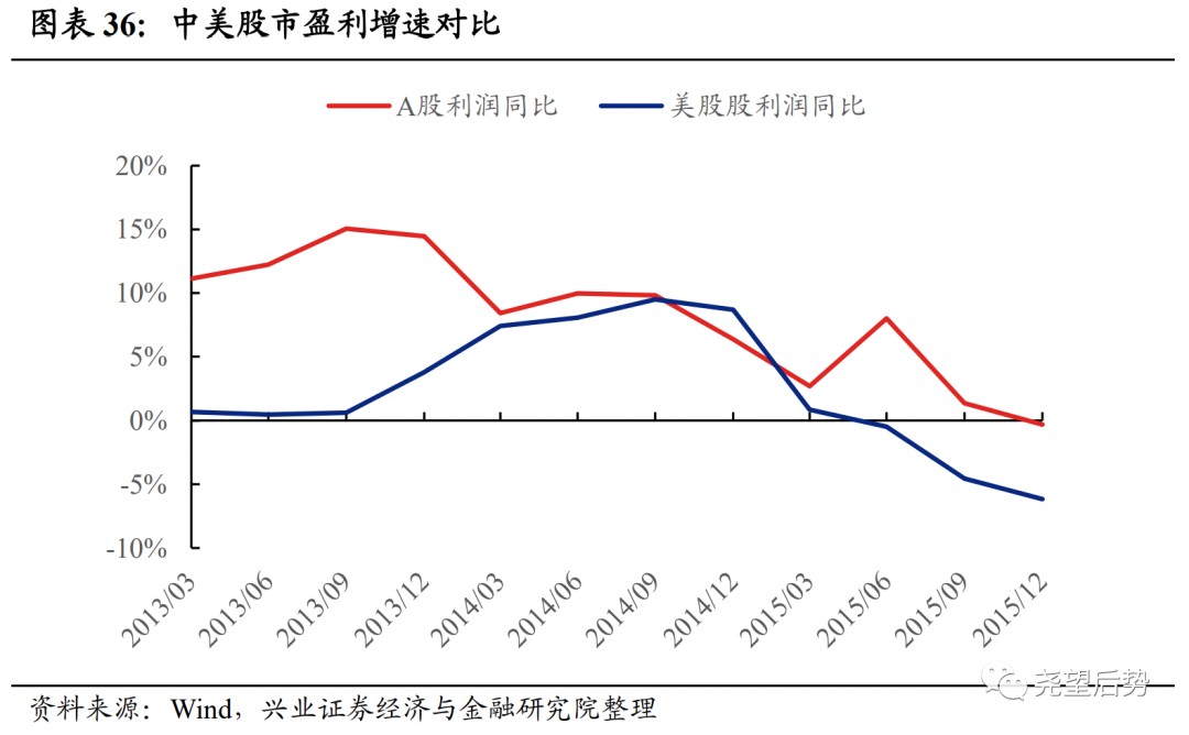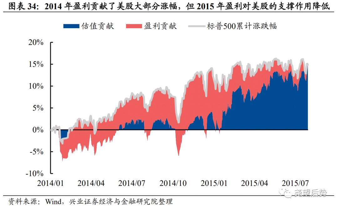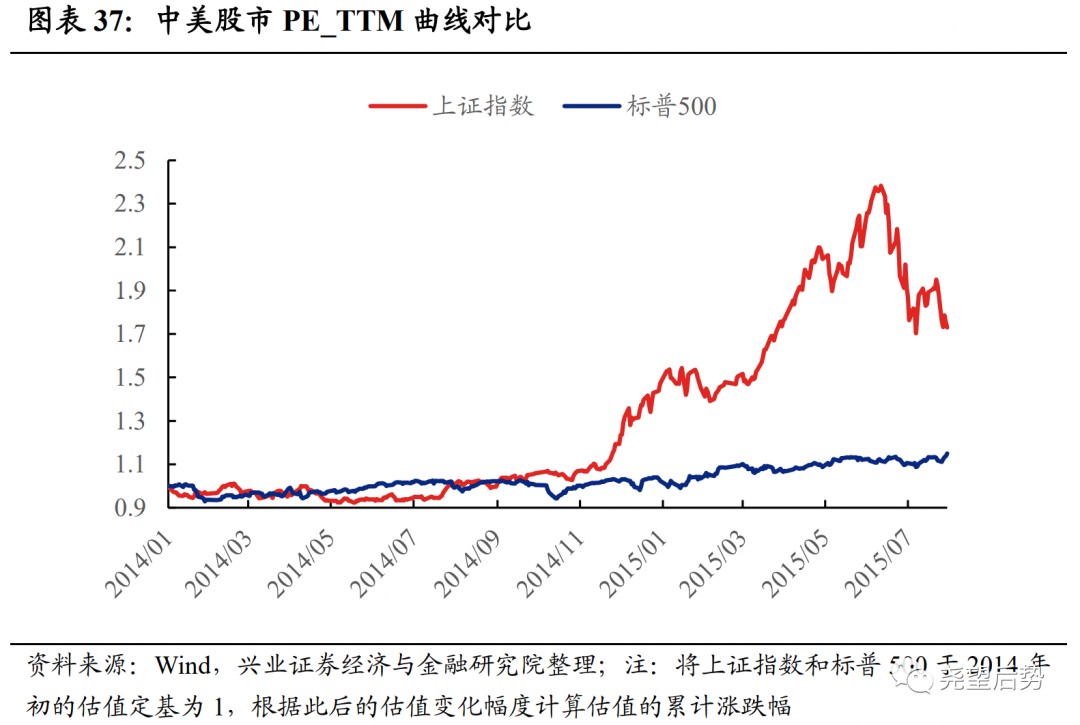 在企业盈利增速均处于震荡下行的阶段时,“内松外紧” 的流动性环境使中美两国股市估值扩张的幅度 “相差甚远”。拆分估值与盈利来看,估值涨幅的分化是导致本轮中美股市显著背离的核心原因。2014Q1-2015Q1,A 股与标普 500 利润增速的绝对值和走势较为相似。但是错位的货币政策导致中美股市估值显著分化,2014 年 7 月至 2015 年 6 月,上证指数 PE_TTM 由 9.1 上涨近 1.5 倍至 22.5,而同期标普 500 的动态市盈率涨幅仅为 8.7%。