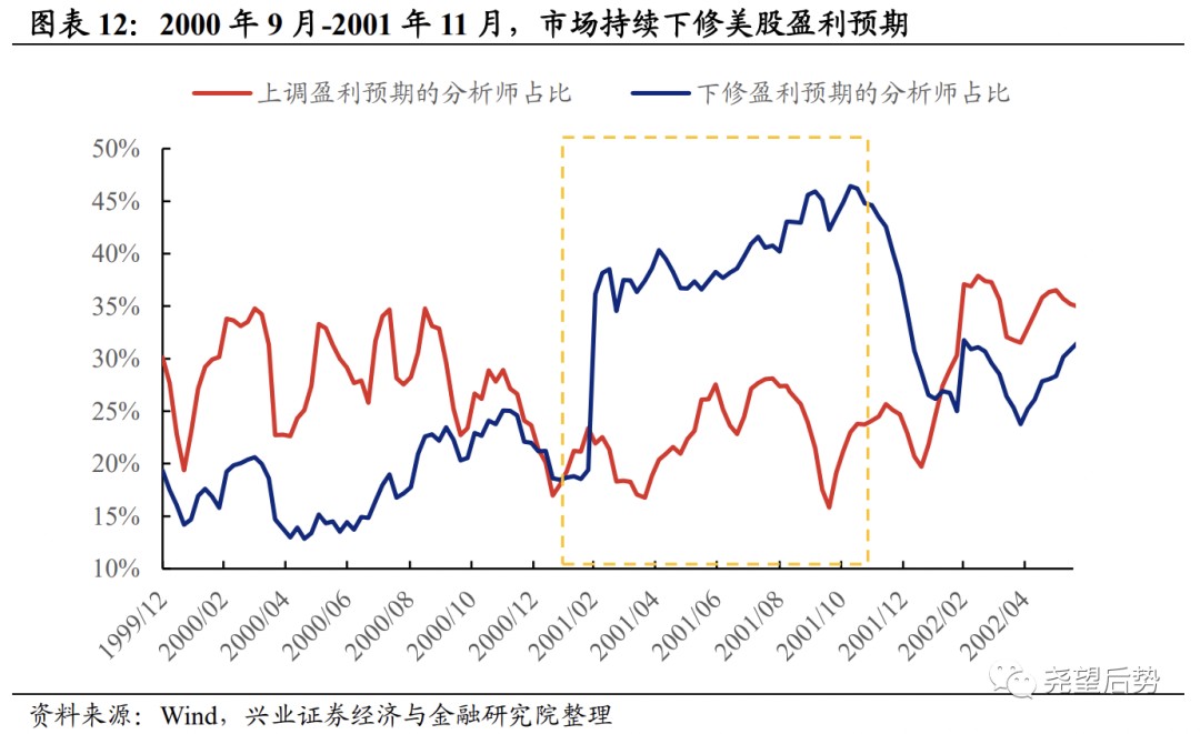 从企业盈利预期的下降到盈利实际的回落,叠加相对较高的估值,美股遭遇 “戴维斯双杀”。盈利层面上,随着经济陷入衰退,叠加油价居高不下,美股盈利面临极大的回调压力。2000 年 8 月以来,苹果公司三次发布盈利预警,2001 年 2 月逐渐开始披露的业绩更是验证了市场的担忧,微软、英特尔等科技龙头的 2000Q4 业绩增速远不及市场预期。并且随着经济下行,对盈利的悲观预期逐渐从科技板块蔓延至全部美股,2000 年 9 月至 2001 年 10 月,市场持续下修对美股的盈利预期,下修标普 500 盈利预测的分析师占比由 18.4% 上升至 46.4%。估值层面上,尽管美联储即使转向、长端利率也处于下行通道,但悲观的盈利预期依然使标普 500 的估值由 2000 年 9 月的 26.7 回落至 2001 年 6 月的 23.5。此外,2001 年 3 月 5 日,财富杂志发表《安然股价是否高估?》一文,使上市公司的财务造假问题持续发酵,叠加阿根廷爆发金融危机,导致市场情绪降至冰点。