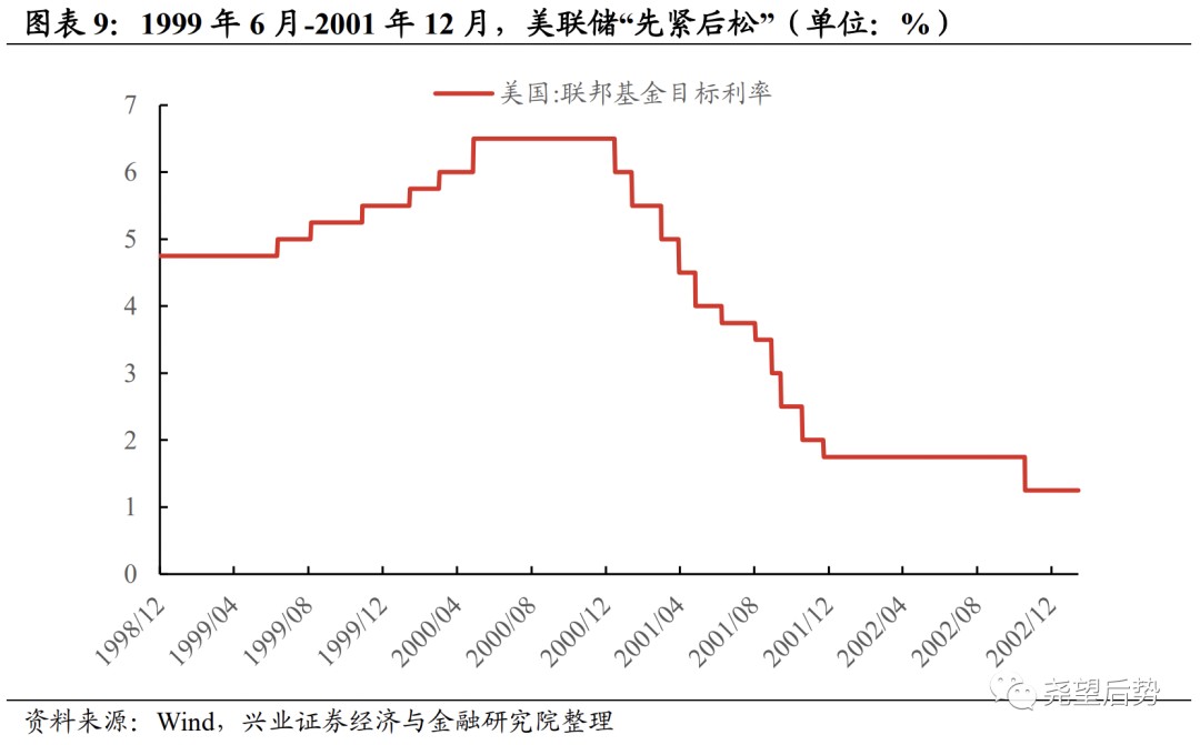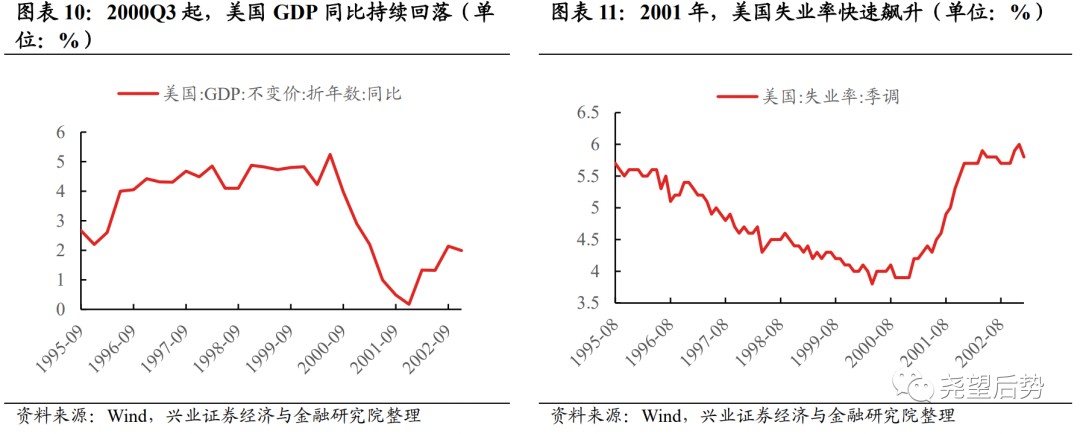 2000 年以来,美国经济增长逐渐放缓,企业盈利收缩。面对有过热倾向的经济,1999 年 6 月至 2000 年中,美联储持续加息,将联邦基金目标利率由 4.75% 上调至 6.5%。收紧的货币政策使美国经济增速快速回落,制造业 PMI 于 1999 年 12 月开始回落,2000Q1 以来,经存货计价和资本调整的美国企业利润跌入负增长区间,2000 年 5 月失业率环比上涨 0.2pct 至 4%,GDP 同比也于 2000Q2 筑顶。基本面的拐头向下使市场担忧美国经济陷入衰退,体现为 10-2 年美债收益率于 2000 年出现倒挂。