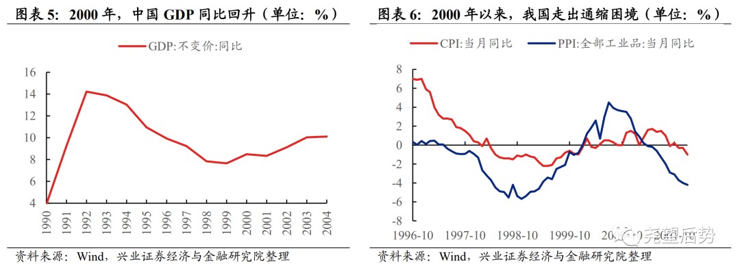 2000 年,中国经济增速反弹并走出通缩困境。随着货币政策和财政政策维持宽松,叠加以国企为主导的国民经济在抛去沉重负担之后,也在连续的政策组合拳之下开始逐步回暖,国内经济温和复苏,国内工业品价格也逐步企稳回升。2000 年中国 GDP 同比录得 8.49%,环比 1999 年上升 0.83pct,结束了此前连续 8 年经济增速的回落。此外,进入 2000 年以后,我国的 PPI 和 CPI 同比增速先后回升至正增长区间,结束了此前的通缩困境。