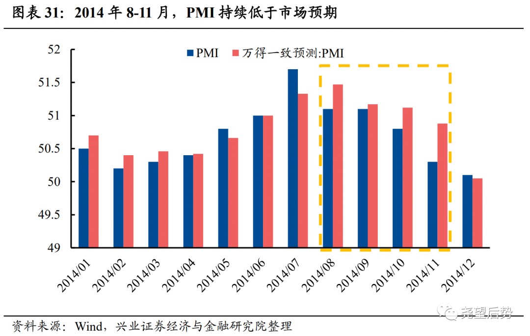 受经济持续低于预期等因素拖累,2014 年三、四季度期间市场多次波动调整。尽管 2014 年初开始政策端 “稳增长” 已在持续落地,但由于实体经济加杠杆动力较弱,2014 年下半年宏观数据仍持续不达预期。在 7 月大涨后, 8、9 月下旬,市场又连续因为宏观数据不及预期而出现调整,10 月中下旬更因为叠加美联储宣布退出 QE4、沪股通延期等因素而显著回调。