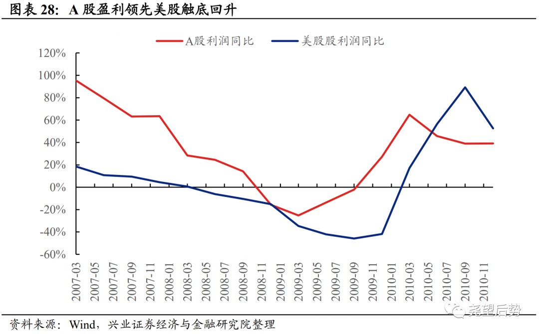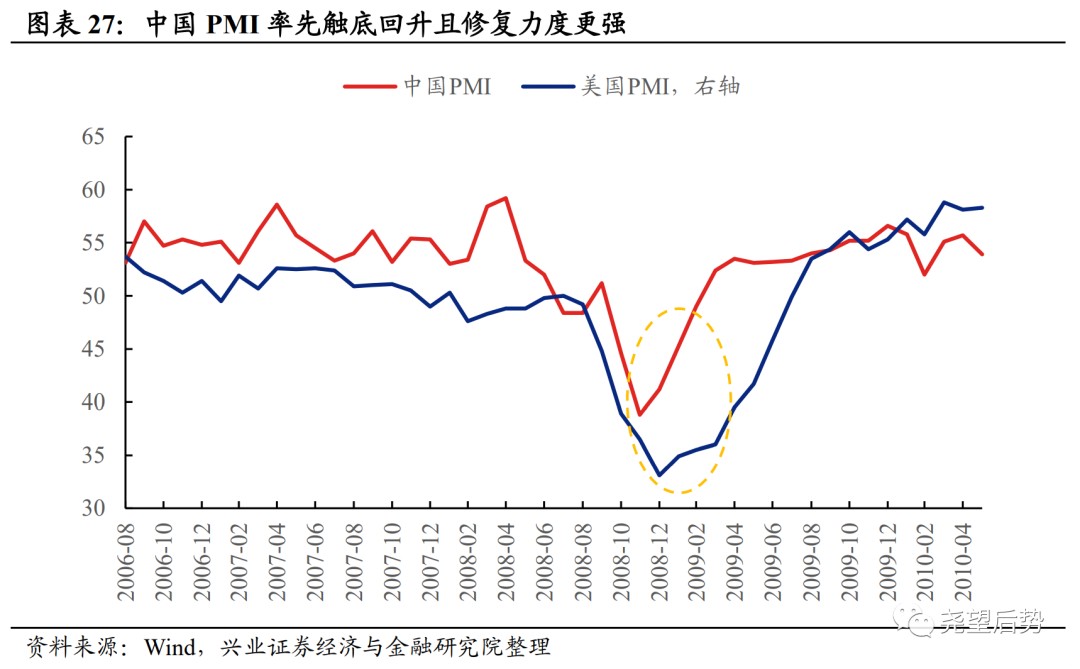 中国经济和企业盈利基本面领先美国经济和美股出现改善的拐点。宏观层面上,从 GDP 同比来看,中国的复苏拐点领先美国一个季度、且修复力度也相对更强;从更为高频的 PMI 数据来看,由于大规模的刺激政策出台更早,中国 PMI 于 2008 年 12 月触底回升,领先美国制造业 PMI 一个月,修复斜率同样更为陡峭。微观层面上,A 股营收和归母净利润增速的拐点出现于 2009Q1,而标普 500 营收和归母净利润增速的拐点则出现于 2009Q4 和 Q3,落后 A 股 2-3 个季度。