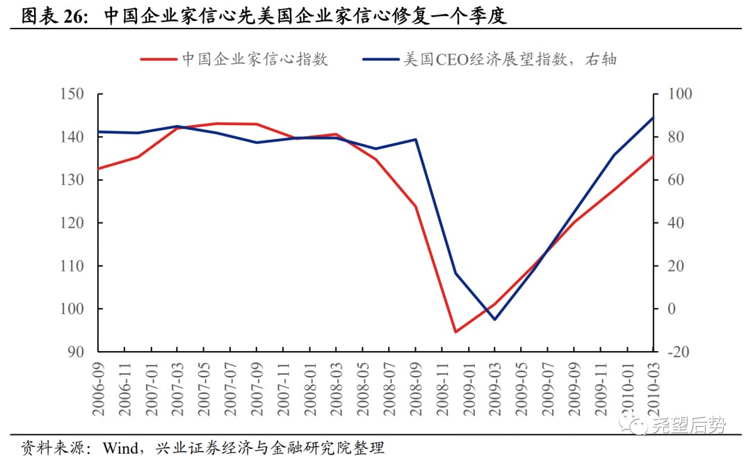 中国的刺激政策更加 “一锤定音”,对市场信心的修复作用更为强烈。对比 2008 年 11 月左右中美出台的政策来看,“四万亿计划” 或对经济改善的作用更为直接和有效。美联储于 08 年 11 月 25 日推出的 QE 主要包含的是对地产相关债券的购买,对经济直接的促进作用不够显著,此外,时任美财长的保尔森在向众议院金融服务委员会作证时称:“联邦政府推出 TARP 计划的目的是稳定金融市场和信贷流,而并非刺激经济或帮助经济复苏”。更有力的刺激政策给予中国投资者更为强烈的经济改善预期,中国企业家信心指数于 2008Q4 触底。美股方面则是直到奥巴马政府推出能够更为直接促进经济复苏的 ARRA 法案,且美联储将 QE 的购买范围扩大至国债后,市场信心于 2009Q1 才有所修复,美股亦才逐渐企稳。