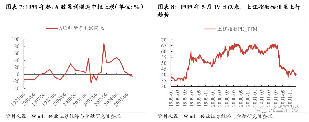 随着国内经济和企业盈利复苏、流动性环境维持宽松、叠加前期国内资本市场支持政策密集发布并生效,1999 年 5 月中至 2001 年 6 月中下旬, A 股市场在进入新世纪后很快开启了新一轮的上涨。盈利面上,1999 年以来,A 股归母净利润增速较前期中枢上移,估值面上,政策宽松的背景之下,资金利率低位运行,上证指数 PE_TTM 逐渐上升至 65 左右。