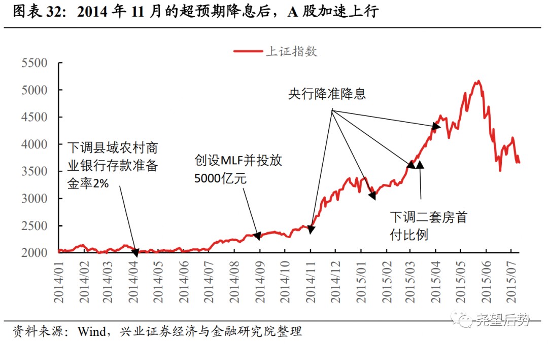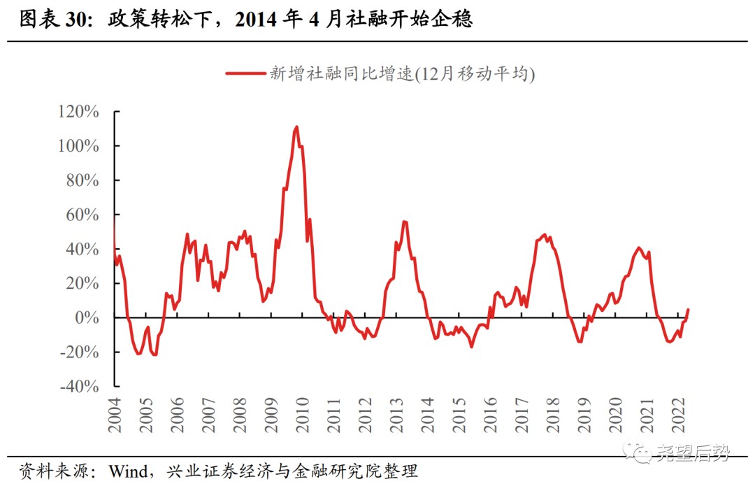 14 年 4 月以来,国内货币政策逐渐转松。2014 年 4 月 22 日央行宣布下调县域农村商业银行人民币存款准备金率 2 个百分点,下调县域农村合作银行人民币存款准备金率 0.5 个百分点;4 月 23 日,央行宣布在分支行开展信贷资产质押试点;6 月 9 日,央行再次宣布对符合审慎经营要求且 “三农” 和小微企业贷款达到一定比例的商业银行 (不含 4 月 25 日已下调过准备金率的机构) 下调人民币存款准备金率 0.5 个百分点,对财务公司、金融租赁公司和汽车金融公司下调人民币存款准备金率 0.5 个百分点。政策转松下,社融于 2014 年 4 月开始企稳。此后,由于经济恢复不及预期,政策宽松持续加码。9 月,央行创设 MLF 并随即向市场投放 5000 亿中期基础货币,并发布《关于进一步做好住房金融服务工作的通知》明确要求放松限贷。10 月中旬,PSL 开始实际投放。
