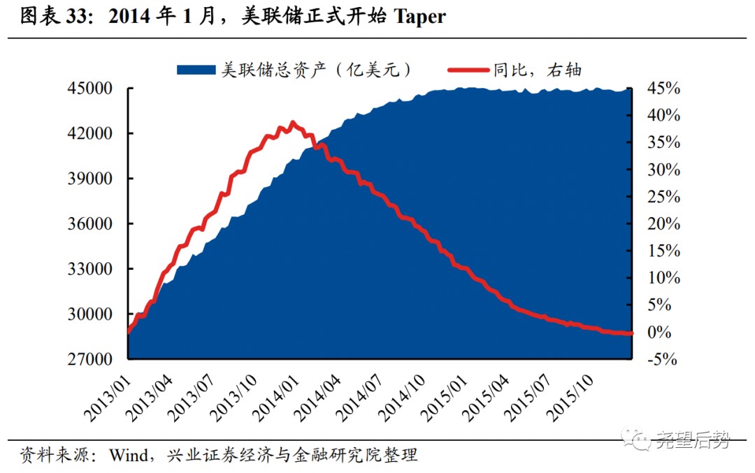 随着经济逐渐过热,美联储也逐渐开始推出宽松的货币政策。2013 年 5 月 22 日时任美联储主席伯南克讲话首次提到,美联储将从下半年某个时点起削减购入资产规模。12 月 18 日的 FOMC 会议上,美联储决定从 2014 年 1 月开始,美联储会将每月购入长期国债与 MBS 的总体规模由 850 亿美元削减至 750 亿美元。2014 年 10 月 FED 正式结束资产购买。2015 年 6 月美联储暗示,鉴于今年早些时候的经济活动下滑迹象已减退,该央行将在未来数月内采取加息行动。2015 年 12 月 17 日,美联储正式宣布加息 25bp。