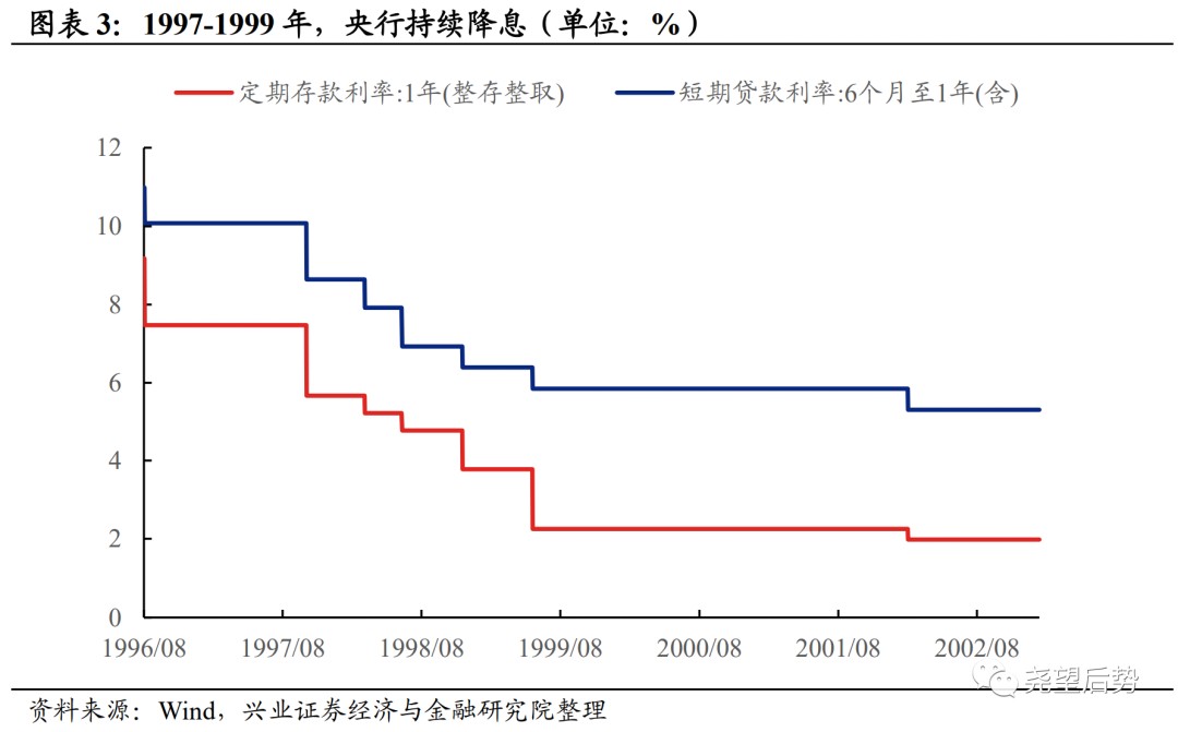 为维稳经济,1997 年底起,中央政策加速放松。面对持续下行的国内经济增速和亚洲金融危机的冲击,央行于 1997 年 10 月 23 日继续分别下调存贷款利率 1.1% 和 1.5%。与此同时,人民日报还特地发了评论员文章,指出本次降息是坚持适度从紧货币政策下适时掌握调控力度的重大举措。随后,1998 年年初召开的 “两会” 上,总理在政府工作报告中提出 “保 8” 目标,即确保经济增长率不低于 8%,此后更为此提出了一系列政策措施,包括:(1) 实行积极的财政政策,每年增发 1000 亿元国债,进行大规模基础设施建设等。根据统计从 1998 年到 2001 年间,当局发行长期建设国债 5100 亿元,而各大国有商业也发放了同等额度的 “配套资金”;(2) 放开民营企业的外贸进出口自主权。(3) 放开房地产市场刺激内需。1998 年 5 月 9 日央行发布《个人住房贷款管理办法》,允许商业银行开展住房按揭贷款的服务。6 月 29 日,国务院决定从 7 月 1 日起,党政机关一律停止实行了 40 多年的实物分配福利房的做法,推行住房分配货币化。自此中国房地产市场完全走上了商品化道路。(4) 注资国有商业银行,化解金融风险。1998 年 11 月,财政部发行了 2700 亿元特别国债,用于补充四家国有银行的资本金,特别国债用 3 月降低法定准备金率后增加的可用资金购买。之后又于 1999 年成立四家 AMC 公司以剥离四大商业银行及国家开发银行近 1.4 万亿元不良资产。