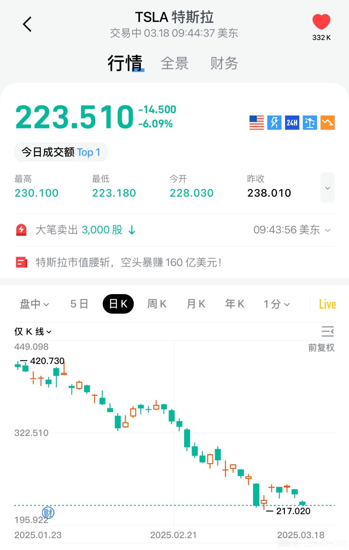 3 月 18 日美股開盤,開盤十五分鐘,特斯拉跌超 6%,各大行下調目標價。